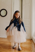 Сукня.Світло-бежевого кольору, виконана з м’якої євросітки. Пишна міді-спідниця створює легкість і об’єм, а рукав «розлітайка» додає ніжності силуету.Ліф має елегантний квадратний виріз, декорований глітерною сіткою із золотими ромбами та акцентною синьою оксамитовою стрічкою. На спинці — зручна шнурівка.